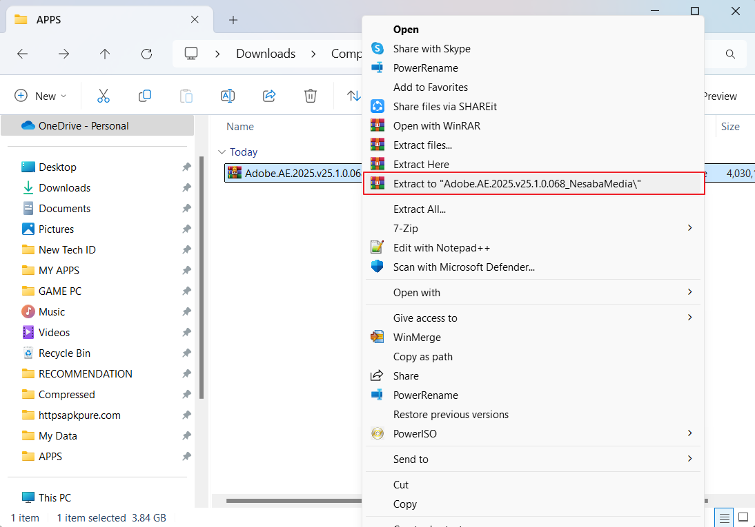 1. Terlebih dahulu kamu harus menonaktifkan sementara antivirus pada komputer kamu, bisa dicek disini. Selanjutnya kamu ekstrak file installer Adobe After Effects 2025 dengan cara klik kanan > Extract to.